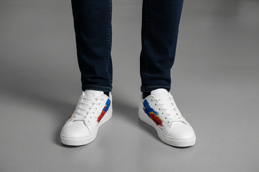 Men's Low-Top Sneakers — Red, Blue & Yellow Star Brushstroke Leather Sneakers